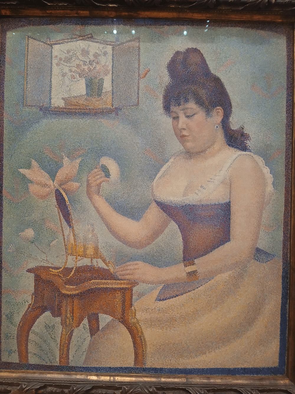 Nell’ampia sala dell’ultimo piano si resta ammaliati dalla tecnica del puntinismo, che ritroviamo in alcune tele di George Seurat, pittore francese considerato il precursore di questa originalissima tecnica pittorica. Seurat non realizza solo paesaggi con questa sofisticata tecnica, ma anche ritratti, come quello affascinante di una donna che si incipria.