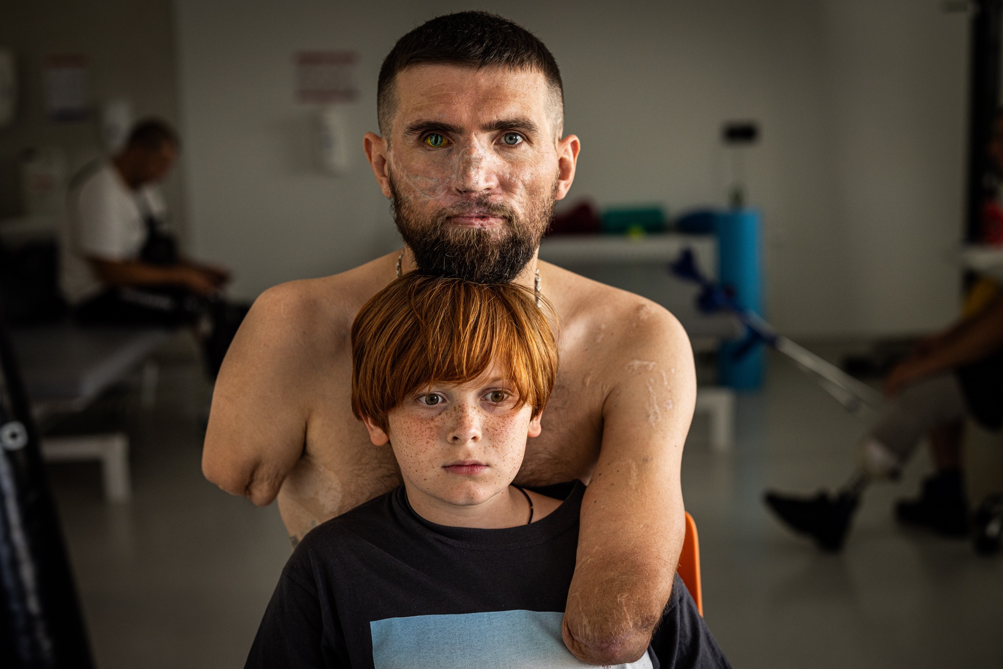 Il corpo di Zakhar è una mappa vivente della violenza della guerra: ha perso entrambe le braccia, una gamba e un occhio, e la sua udito è parzialmente compromesso a seguito di una devastante esplosione. Accanto a lui, in piedi, c’è il figlio Yehor.