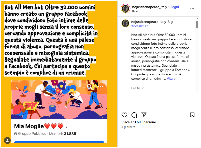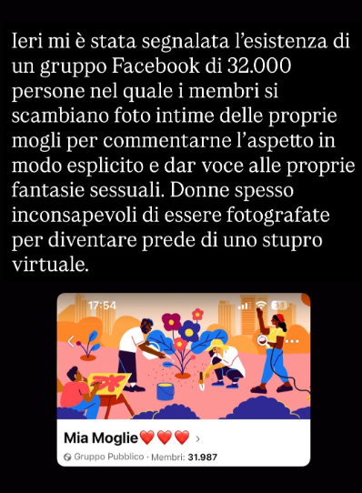 Il 20 agosto 2025 Meta ha rimosso da Facebook il gruppo “Mia Moglie” (in quel momento contava circa 32mila iscritti), dopo un’ondata di segnalazioni e denunce alla Polizia Postale. Nel gruppo, pubblico e facilmente accessibile, un numero imprecisato di uomini condivideva foto — spesso intime o rubate — delle proprie partner per sollecitare commenti sessualizzati, denigratori e fantasie esplicite da parte della community. Le segnalazioni sono esplose dopo gli appelli della scrittrice e attivista Carolina Capria (@lhascrittounafemmina) e dell’organizzazione No Justice No Peace.