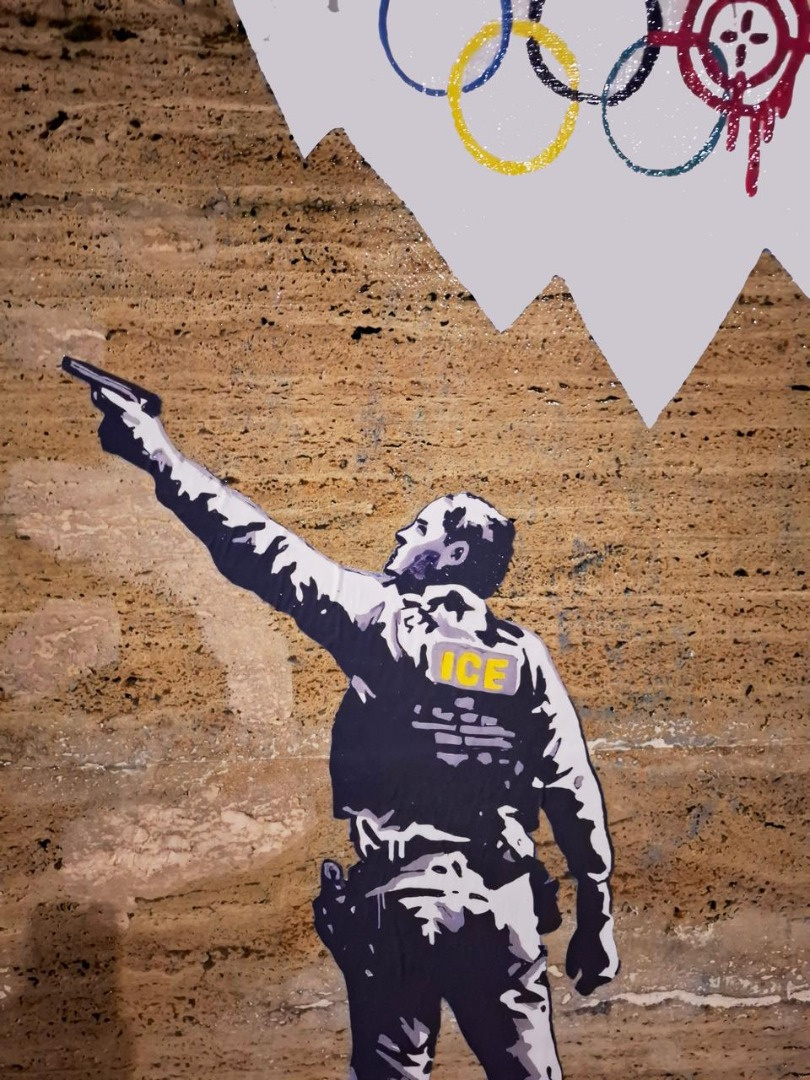 Davanti alla sede del CONI, l’artista ha scelto un linguaggio diretto, senza metafore consolatorie: un agente dell’ICE raffigurato mentre prende di mira uno ski jumper, con una montagna capovolta in cui il logo olimpico si trasforma in un mirino.