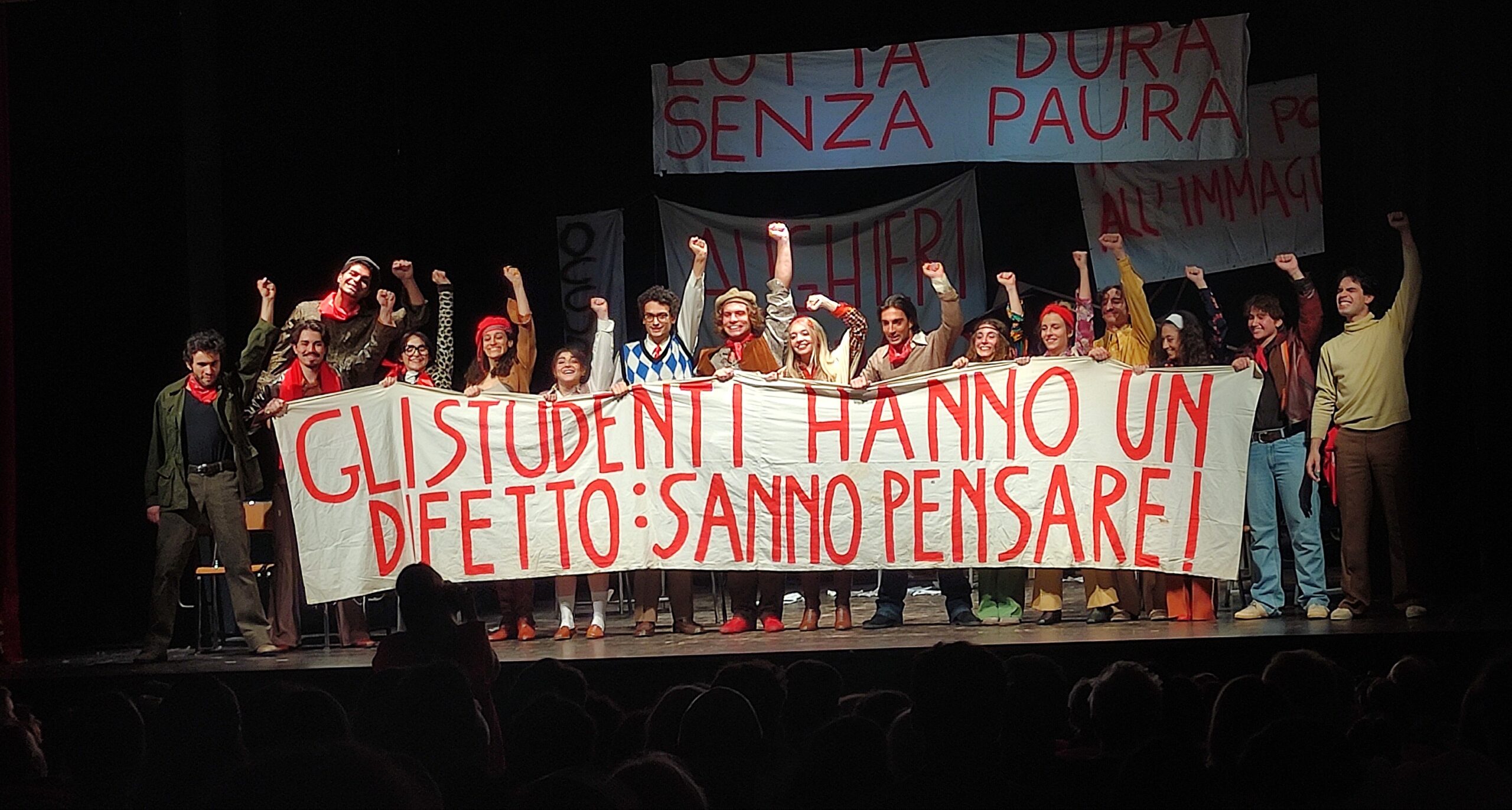 Non è la prima volta che metti in scena questo testo, perché hai voluto riproporlo oggi e come hai scelto questo nuovo e talentuoso cast? Sì, non è la prima volta, addirittura è la quinta volta: questo spettacolo nasce nel 2008 e poi ha una serie di altre versioni successive. È un testo che è sempre attuale, anche oggi. Ho immaginato che sarebbe stato divertente anche in questi giorni, raccontare quelle due storie ambientate nel 2002 e nel 1969. Per il cast ci siamo rivolti naturalmente a giovanissimi professionisti. Hanno fatto il provino più o meno una sessantina di ragazzi per poi prenderne diciassette. Tre di loro sono miei allievi. Cercavo attori con delle capacità che però fossero ancora imbevuti di acerbità. Non abbiamo cercato attori troppo tecnici, anche se a quell’età è difficile che ci siano. Abbiamo cercato di sfruttare, anche nella messa in scena, la freschezza di tutti gli attori data anche dall’inesperienza.